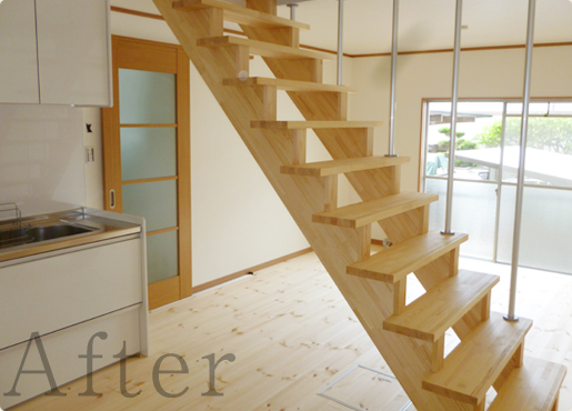 1階のDKと和室をワンフロアにして、階段をストリップ階段にかけ直し、明るく広い空間をご提案しました。