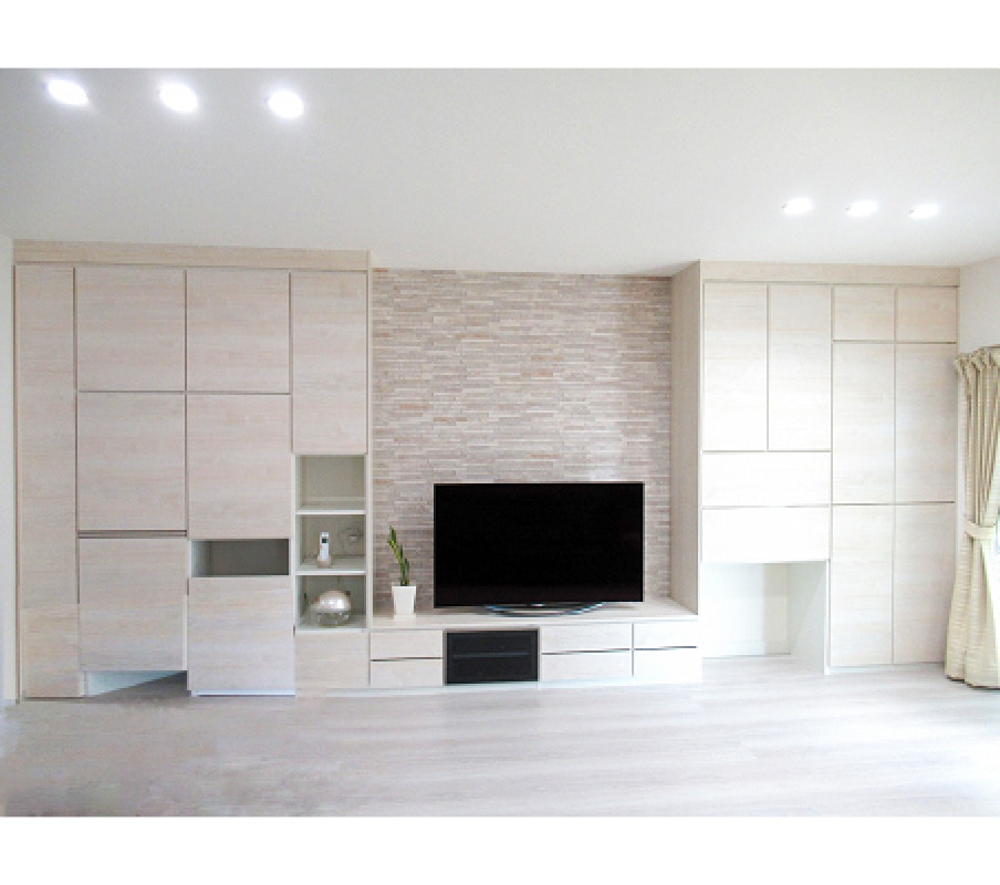 リビングをシーリングライトからダウンライトへ変更し壁面収納を設置しました。